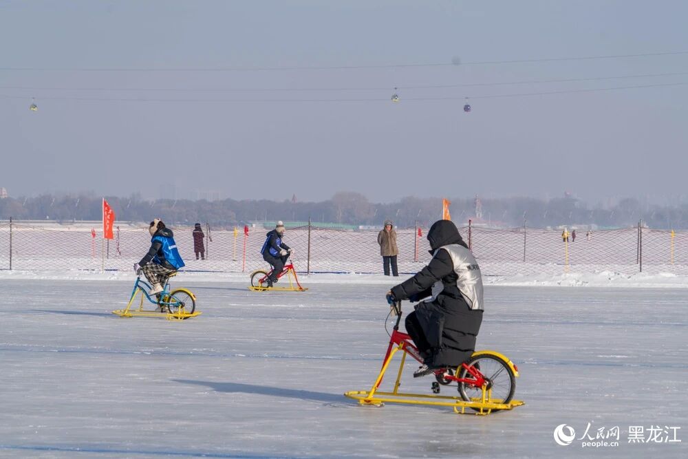 冰上自行车晃晃悠悠地滑行