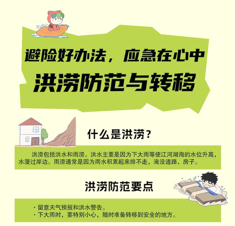 洪水应对方法:洪水来临时,要赶紧往高处跑,大树、房顶都是暂时的“安全岛”,记得准备好食物、手电筒和厚衣服哦。