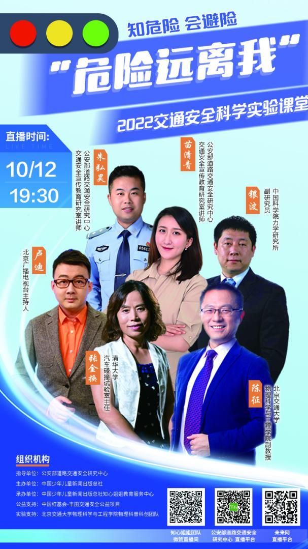 2022年10月12日,由公安部道路交通安全研究中心指导,中国少年儿童新闻出版总社有限公司主办,中国红十字基金会-丰田交通安全公益项目提供公益支持,北京交通大学物理科学与工程学院科普科创团队提供实验支持的 “知危险 会避险 ‘危险远离我’——2022交通安全实验课堂”通过直播的形式与全国的少年儿童见面了。
