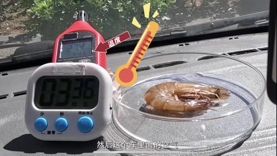 在本次科学实验中,阳光照射下,经过短短十几分钟,密闭汽车内的温度就达到了50-60摄氏度,放在挡风玻璃下的生虾也发生了变色,人类的“幼崽”怎么能耐受得住50-60摄氏度的车内高温?