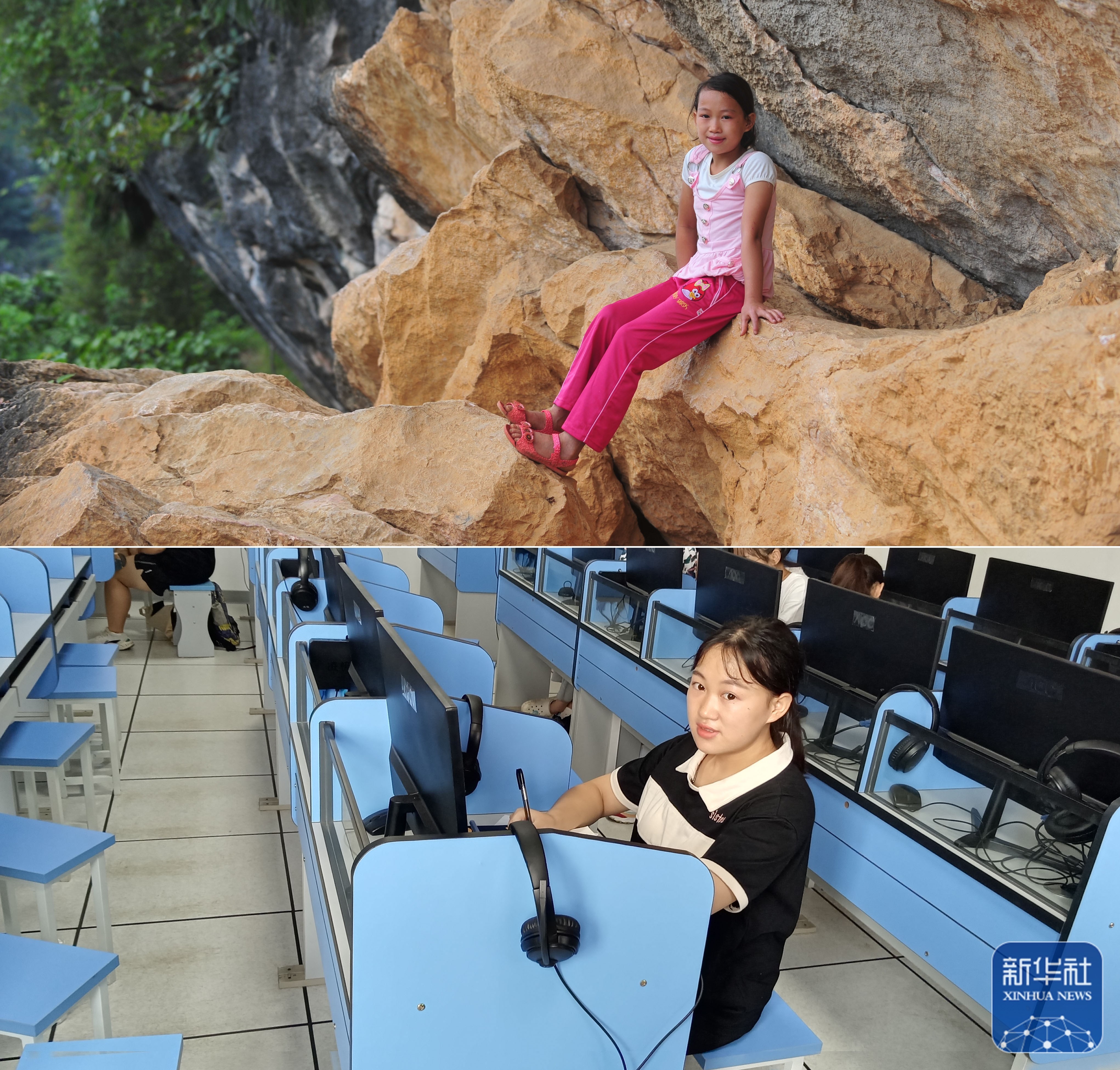 这是一张拼版照片,上图为:在广西大化瑶族自治县板升乡弄雷村哈保屯,11岁的蒙秋艳在悬崖边休息,这一处约300米长的半山悬崖,是她读小学期间每天都要走的路(2012年9月5日新华社记者黄孝邦摄);下图为:已经实现大学梦想的蒙秋艳,就读于广西医科大学,这是她在学校的语音室学习(新华社发,2022年9月5日韦婷婷摄)。新华社发