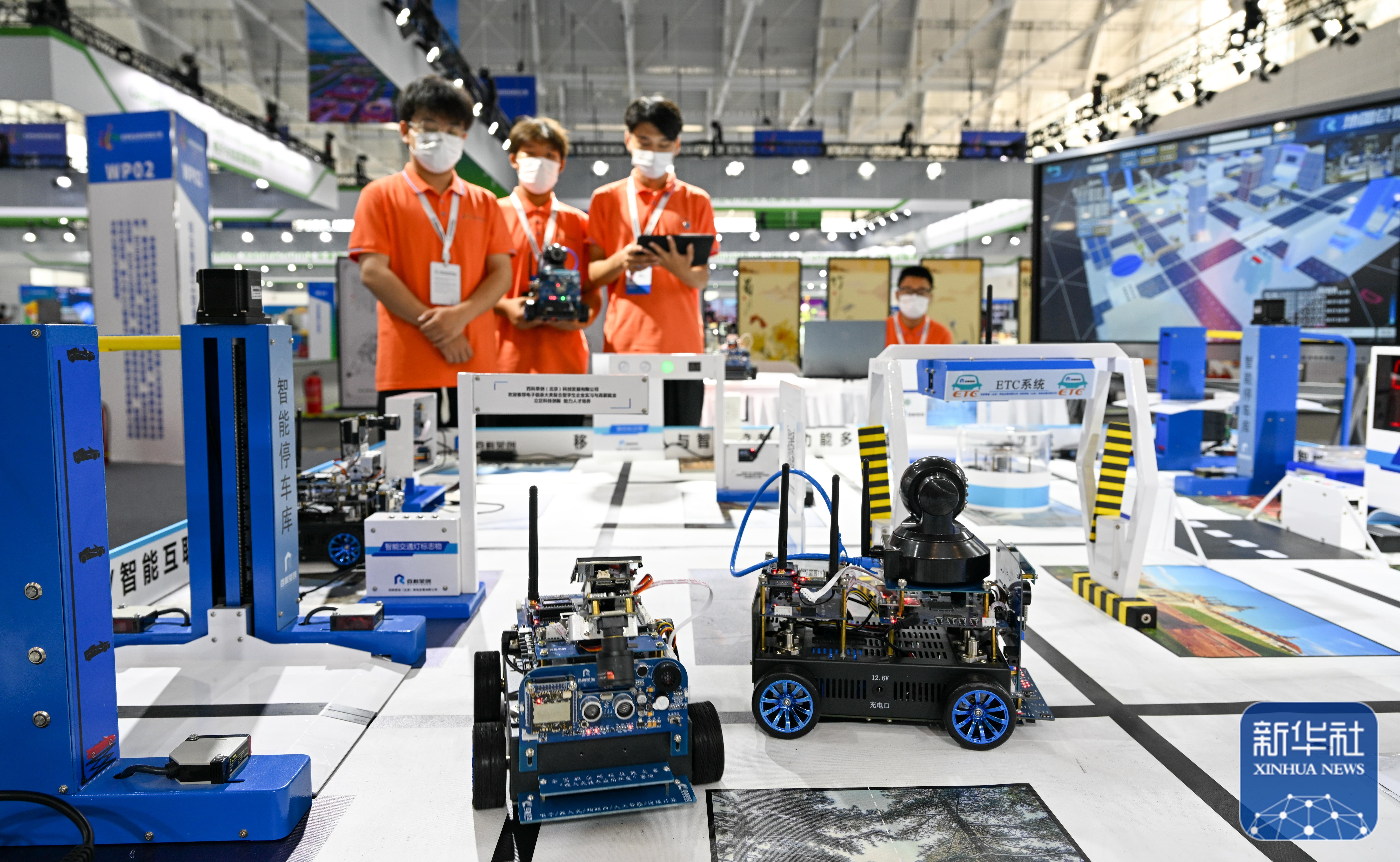在天津举行的世界职业技术教育发展大会首届世界职业院校技能大赛上,参赛选手在实训沙盘前操作机器人设备(2022年8月20日摄)。新华社记者 孙凡越 摄