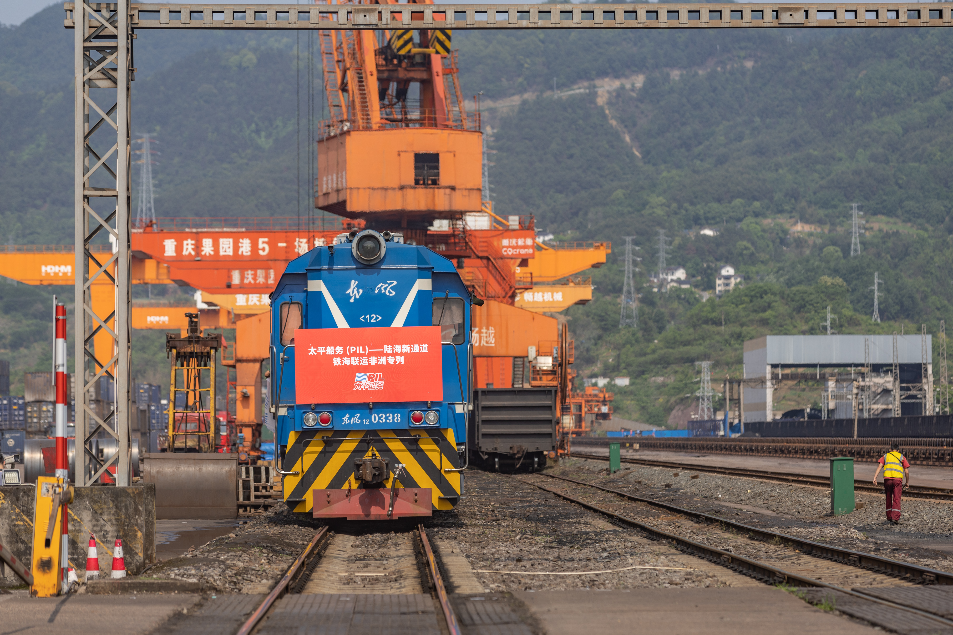 这是2023年4月27日,太平船务——西部陆海新通道江铁海联运非洲专列在重庆果园港鱼嘴站等待发车。