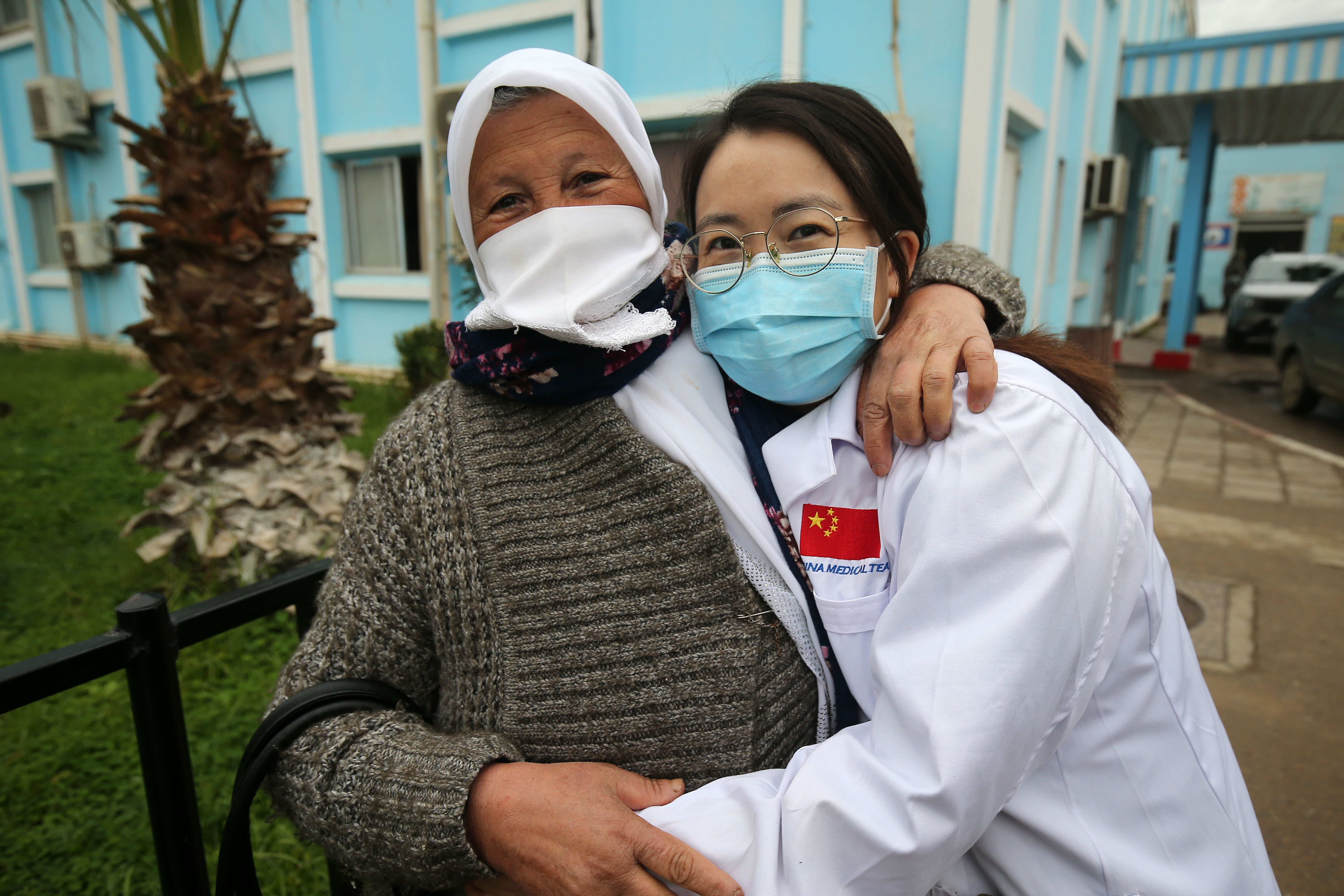2023年2月27日,在阿尔及利亚艾因迪夫拉,63岁的阿里里·赫依拉(左)到医院感谢中国援阿医疗队医生李洪玲。