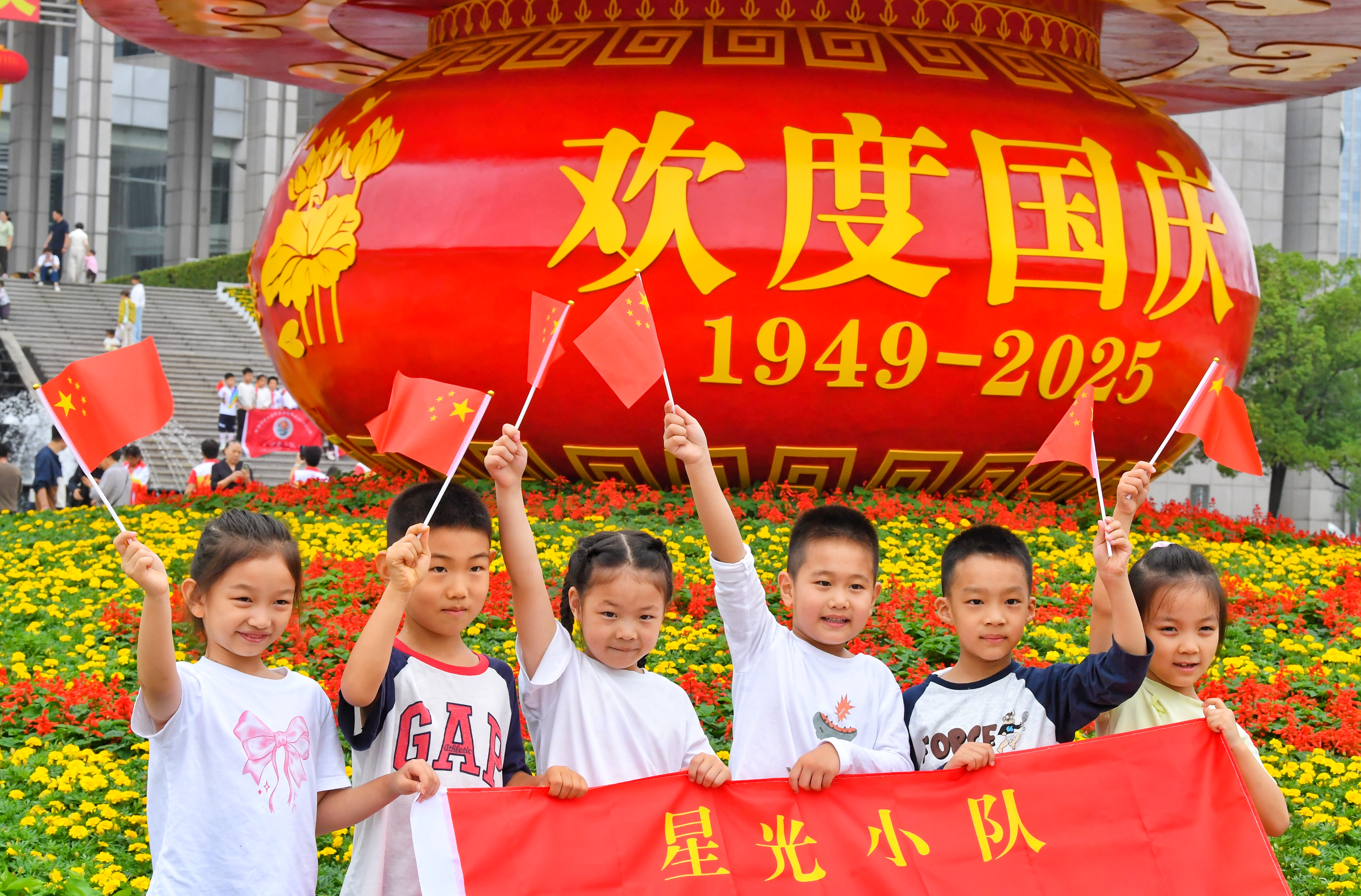 10月1日,小朋友在安徽省合肥市蜀山区市民广场国庆主题花篮前拍照。