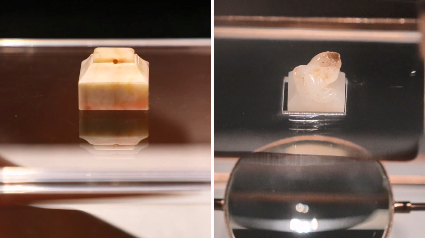 拼版图片:左图为西汉“赵眜”覆斗纽玉印(复制品),右图为“刘贺”螭纽玉印。新华社记者 袁慧晶 摄