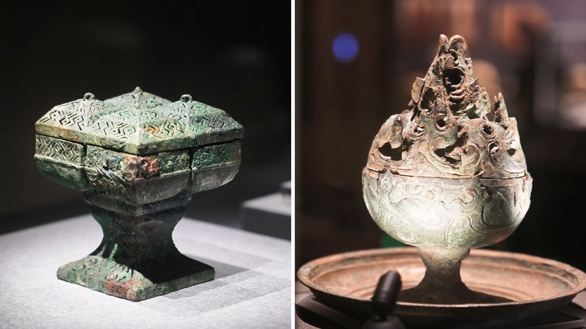 拼版图片:左图为赵眜墓出土的四连体铜熏炉,右图为刘贺墓出土的博山炉。新华社记者 袁慧晶 摄