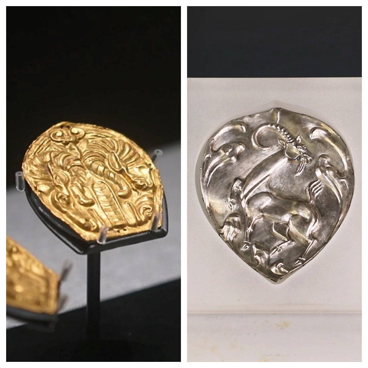 拼版图片:左图为羊头纹杏形金饰片,右图为羱羊银马珂。新华社记者 袁慧晶 摄