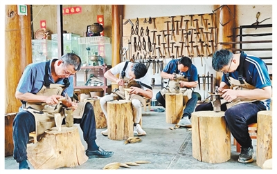 和善均(左一)与徒弟在打制铜器。和善均供图
