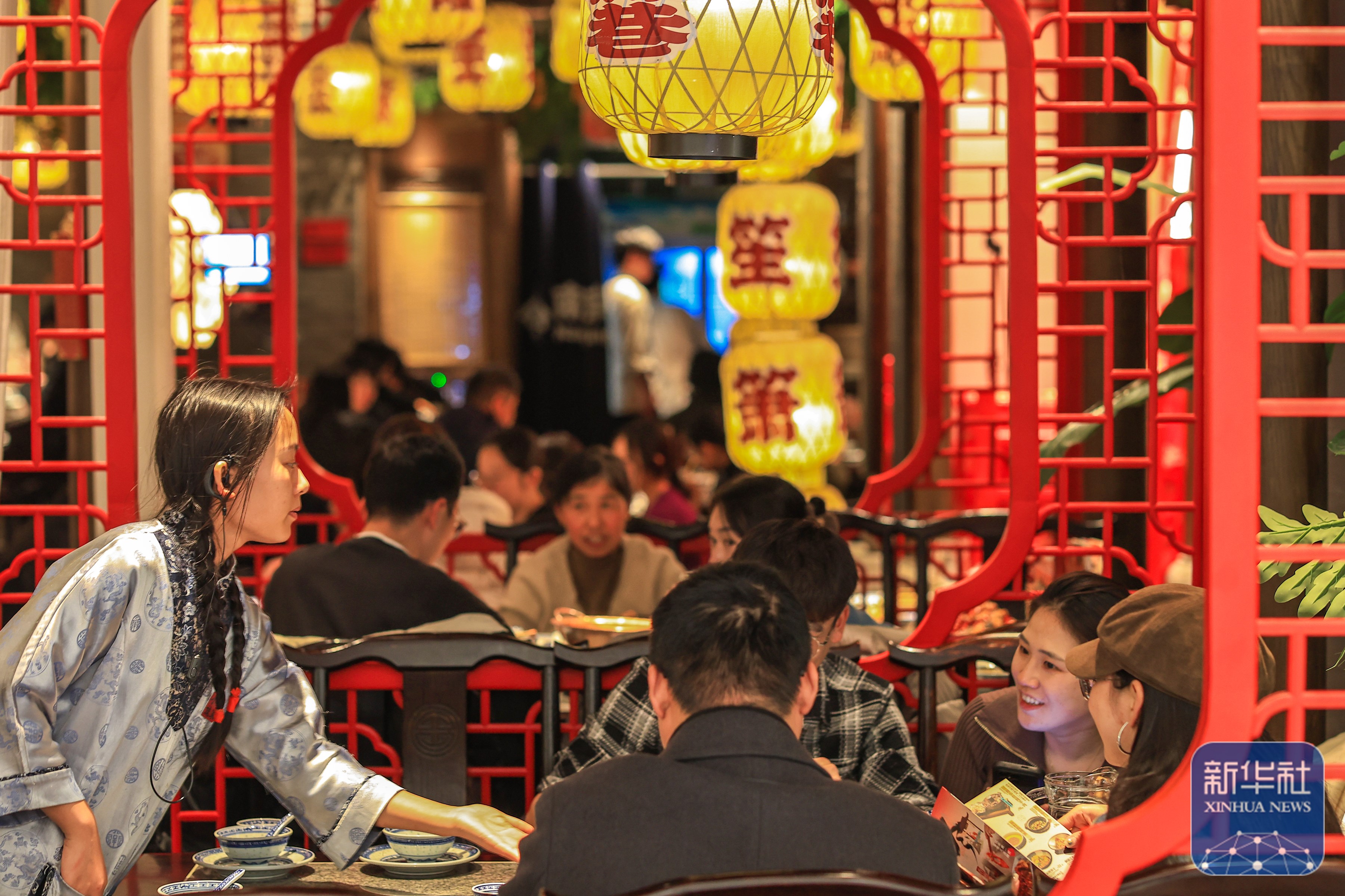 ↑ 1月1日晚,人们在江苏省南京市一家餐馆里用餐。新华社发(辛一 摄)