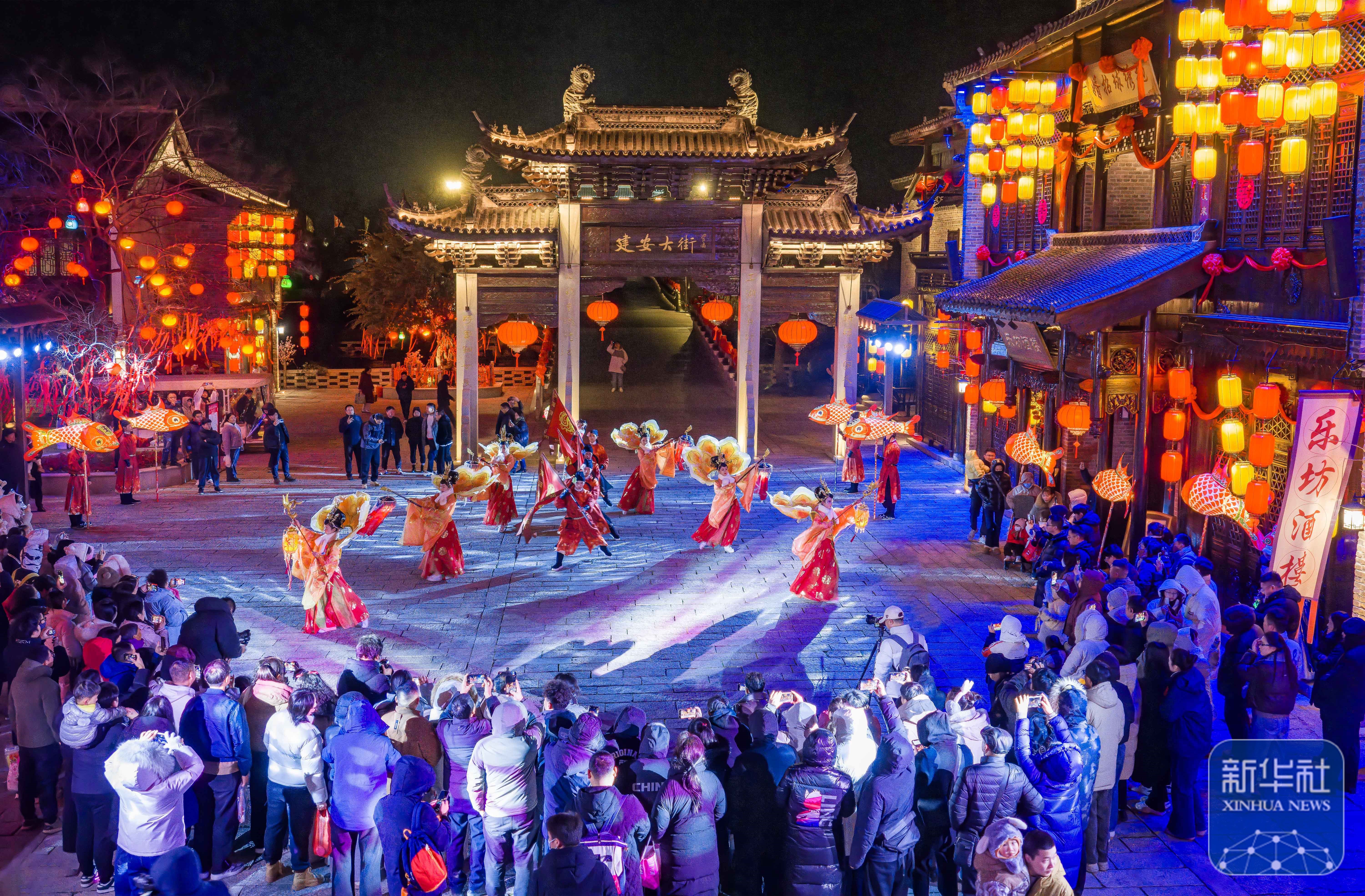 ↑ 1月1日,游客在山东乐陵影视城景区观看表演(无人机照片)。新华社发(贾鹏 摄)