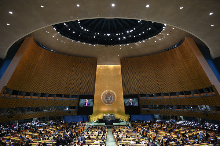 这是2025年9月22日在位于纽约的联合国总部拍摄的联合国大会纪念北京世妇会30周年高级别会议现场。新华社记者 李睿 摄
