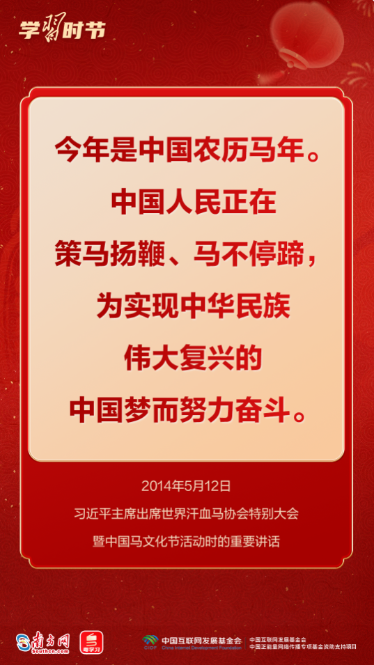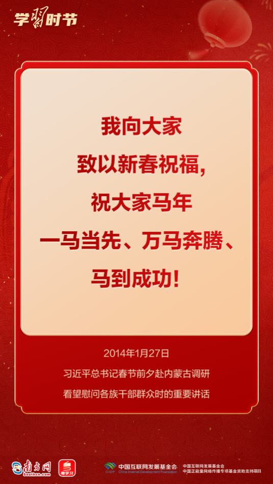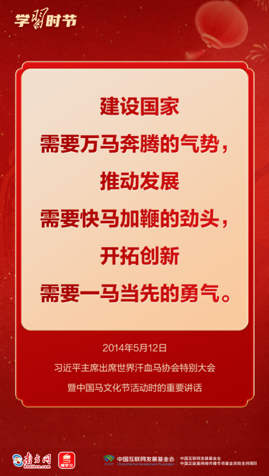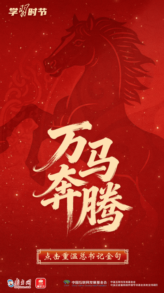 习近平总书记多次用“龙马精神”“马到功成”“一马当先”等耳熟能详的成语,向全国各族人民送上最美好的新春祝福,寄予奋进向上的殷殷嘱托。马年新春,来接收总书记的祝福和寄语,一起策马扬鞭,奔向更美好的明天!