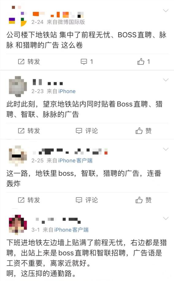 有细心网友注意到,虽然被业内誉为招聘旺季的“金三银四”未至,但全国多地的“战火”早已打响:北京望京地铁站内,BOSS直聘、智联招聘、猎聘、前程无忧和脉脉五家招聘平台的巨幅广告近乎同时出现;前程无忧、BOSS直聘在全国多地人流聚集的地铁站及公交站投放了系列品牌广告;智联招聘也迅速出手,霸屏百城电梯广告位……