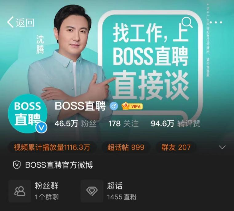 BOSS直聘就更换了数位品牌代言人。从国际科幻影视明星汪可盈,到国际影星盖尔·加朵和知名演员刘涛。2021年1月,BOSS直聘又官宣沈腾作为新一任品牌代言人。