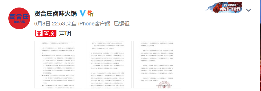对此,6月8日,贤合庄官方微博(@贤合庄卤味火锅)发布声明,否认陈赫收取2.4亿和3.7亿的加盟费,“割韭菜”“跑路”是恶意攻击抹黑行为,公司接下来会维权。
