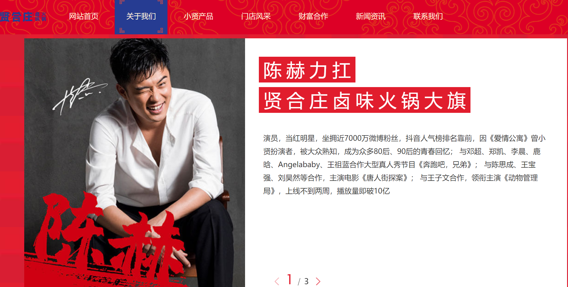 贤合庄是如何体现出明星联动的?在贤合庄官网主页上,随处可见陈赫等明星的大幅照片和相关介绍。