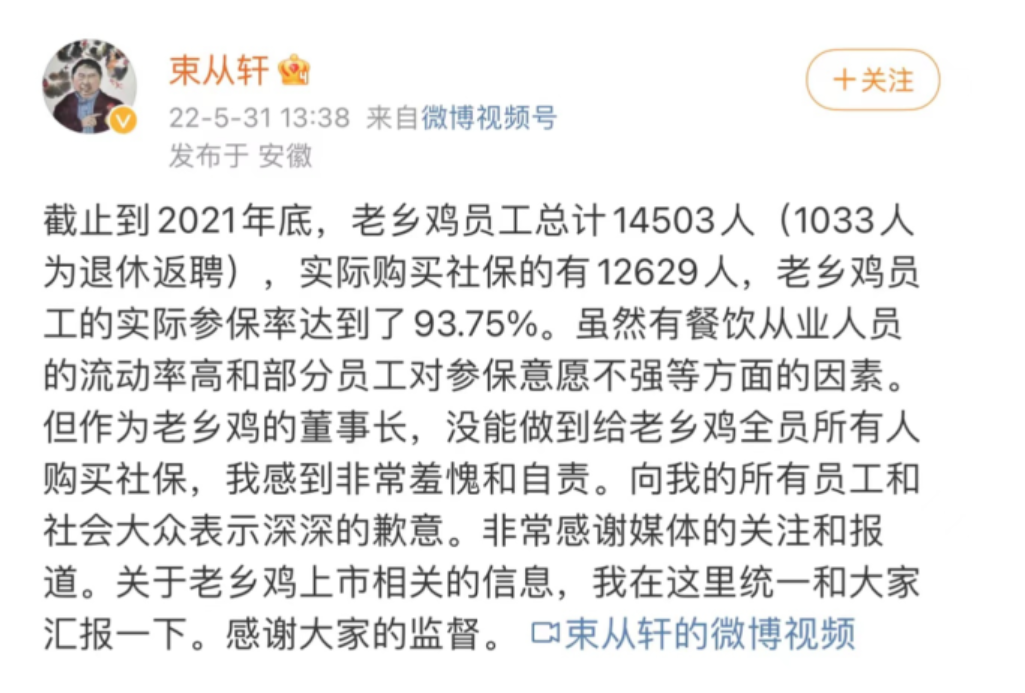 事件引发热议后,老乡鸡董事长束从轩发布视频解释称,媒体将最近三年未参保人数累加得出,存在重复计算问题,导致数据与招股书出现偏差,而老乡鸡2021年实际参保率达到了93.75%。
