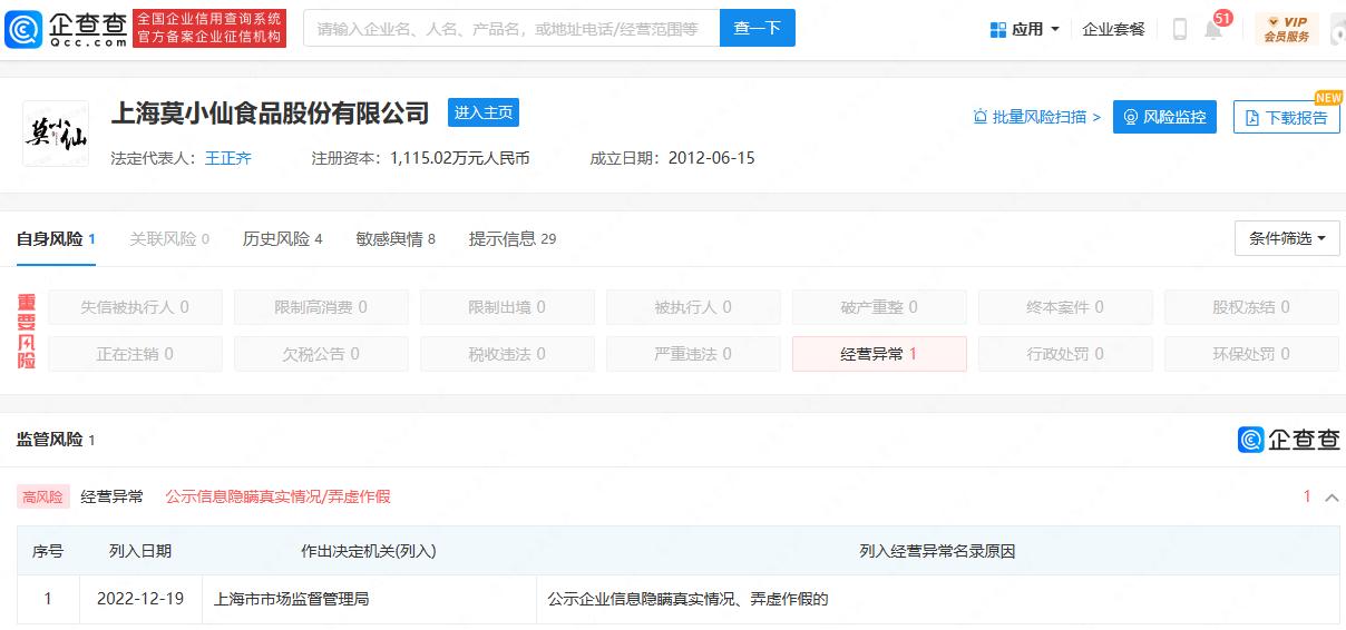 未来网北京12月28日电(实习生 吕豪景 记者 王秀娟 )据企查查APP显示,近日,自热火锅品牌莫小仙关联公司上海莫小仙食品股份有限公司(以下简称“莫小仙品牌”)被上海市市场监督管理局列入经营异常名录,列入原因为其公示企业信息隐瞒真实情况、弄虚作假。