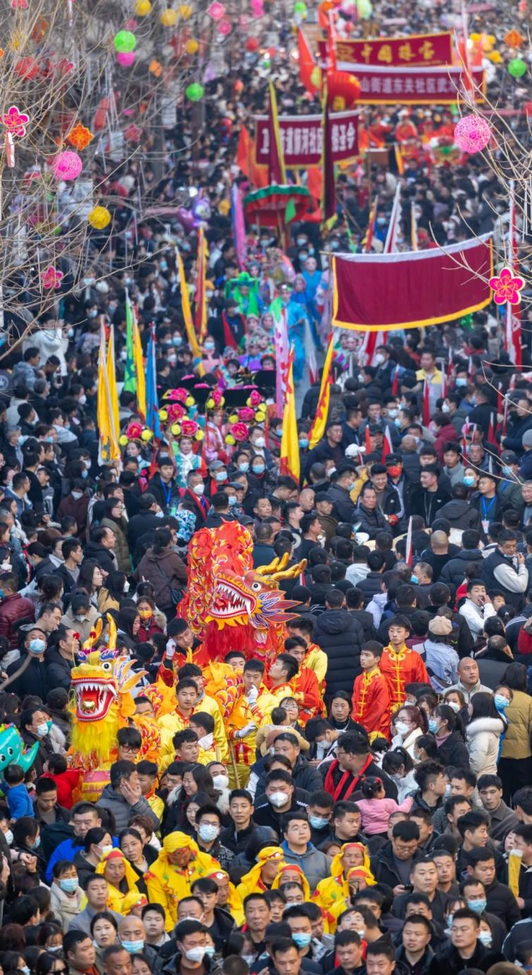 未来网北京2月7日电(通讯员 周晓静 记者 王军伟)农历正月十六,河南省鹤壁市浚县正月古庙会迎来了又一场高潮。二十多支社火表演队伍汇聚一起,像一条人龙,直达浮丘山碧霞宫广场。沿街彩旗招展,锣鼓阵阵,人潮涌动,万人空巷。大家载歌载舞,祈福新的一年风调雨顺,共庆美好生活。
