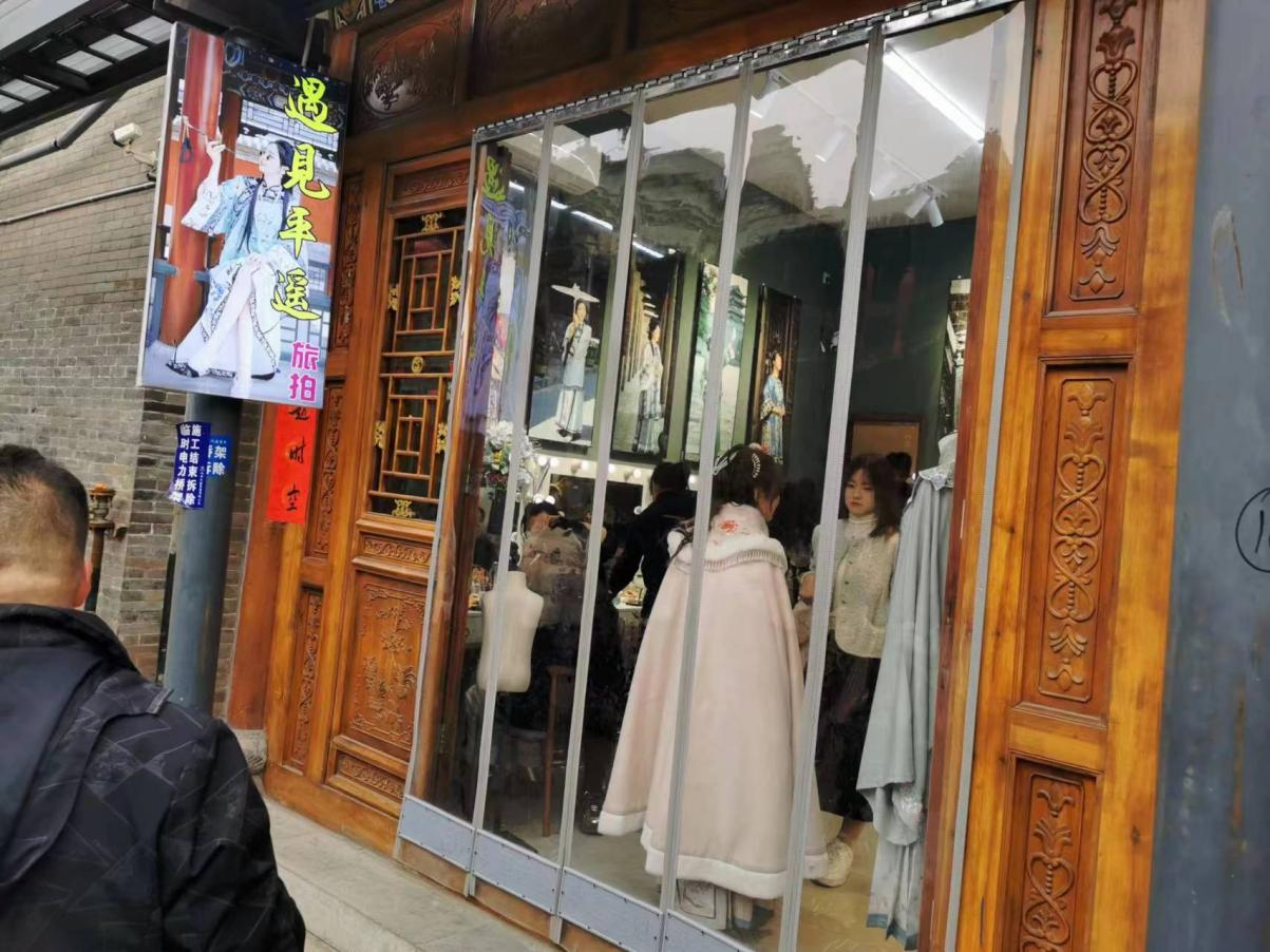 在平遥古城,报道组遇到了来自河南的游客王先生一家,他们身着汉服在古城漫步。王先生告诉报道组,他们在当地的汉服租赁店租借了这些服装,不仅可以穿着汉服在店铺内拍照留念,还可以穿着汉服自由行走在古城中,只要在规定时间内归还即可。