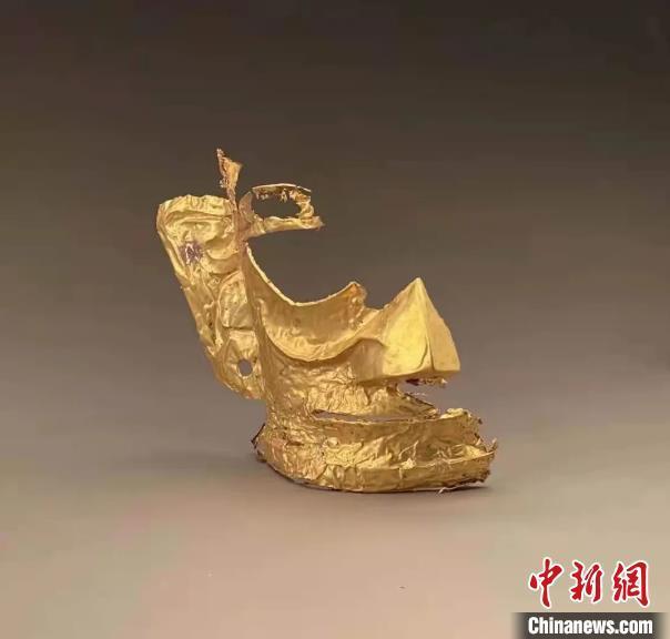 3号祭祀坑被称为8座祭祀坑中的“聚宝盆”,其中也有件金面具。这件金面具眉眼镂空,两耳轮廓圆润,鼻梁高挺,嘴形大而微张。
