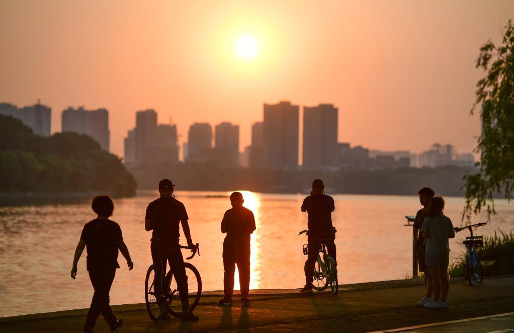骑行的市民在浑河岸边驻足欣赏夕阳。新华社记者 蔡湘鑫 摄