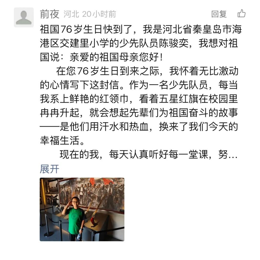 ▼河北省秦皇岛市海港区交建里小学 陈骏奕:现在的我,每天努力学好知识,积极参加少先队活动,因为我知道,少年强则国强。我想对您说:“请您放心!我会像小树苗一样茁壮成长,长大后用所学的本领,让您变得更加繁荣,更加富强!”