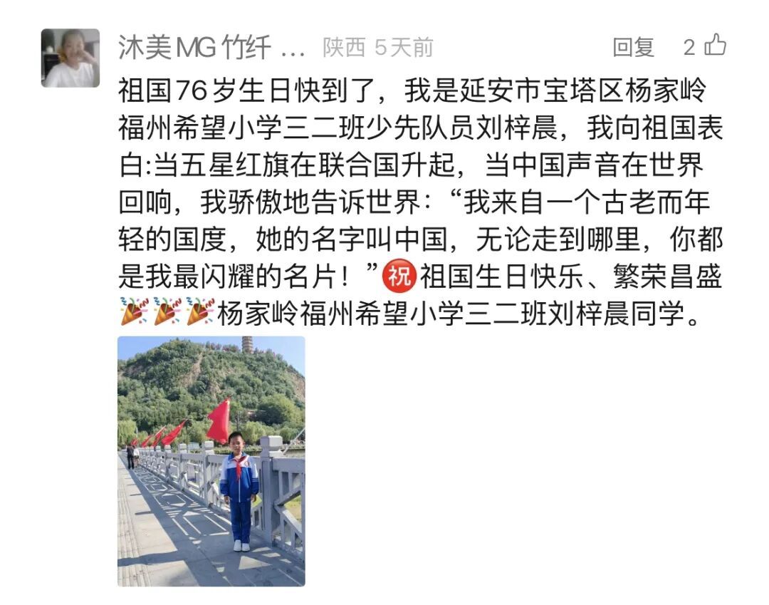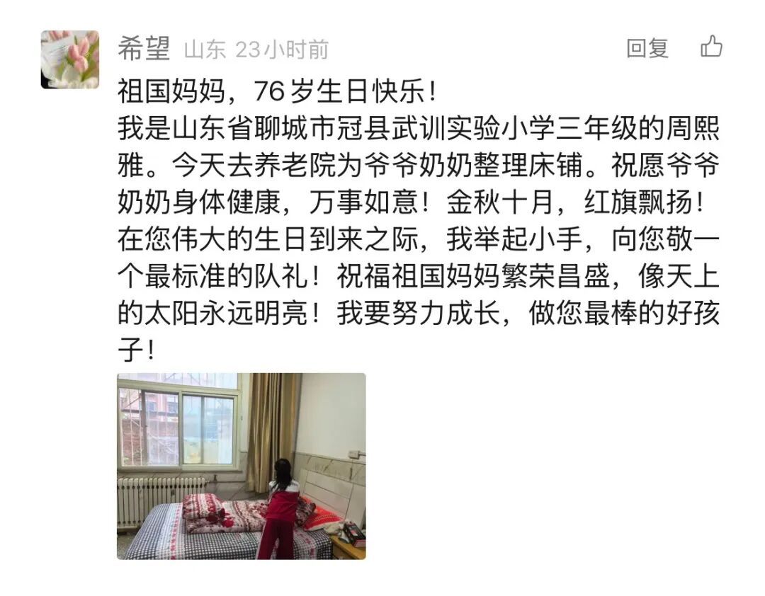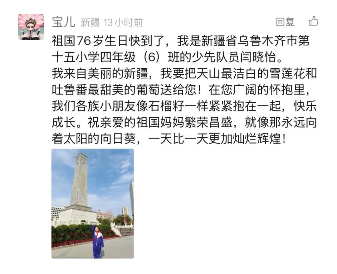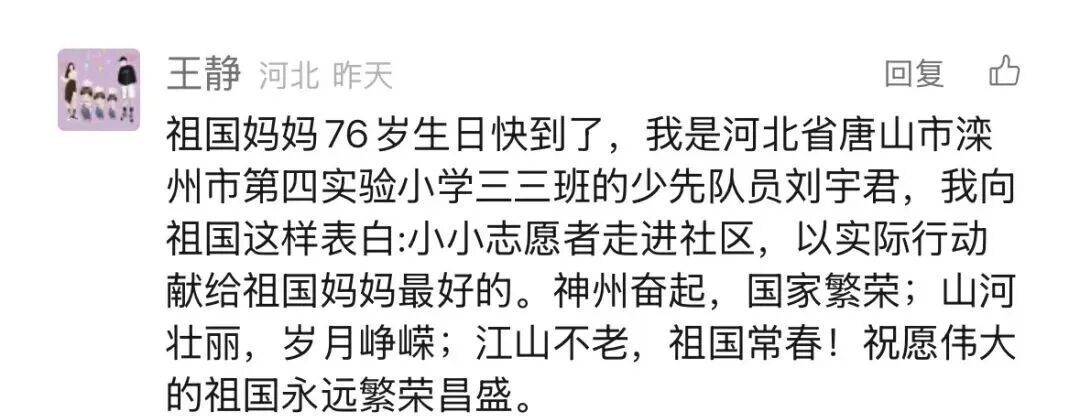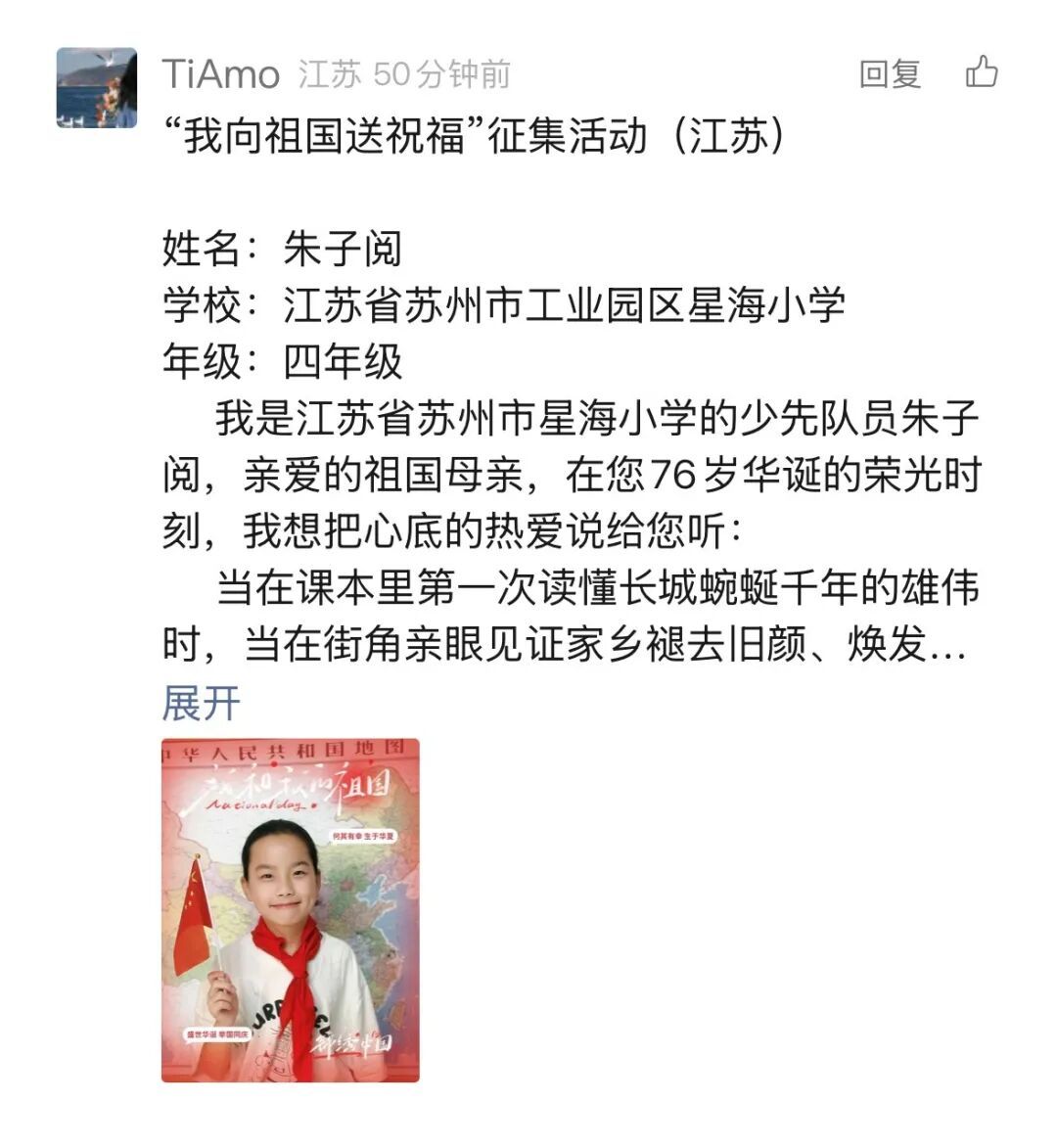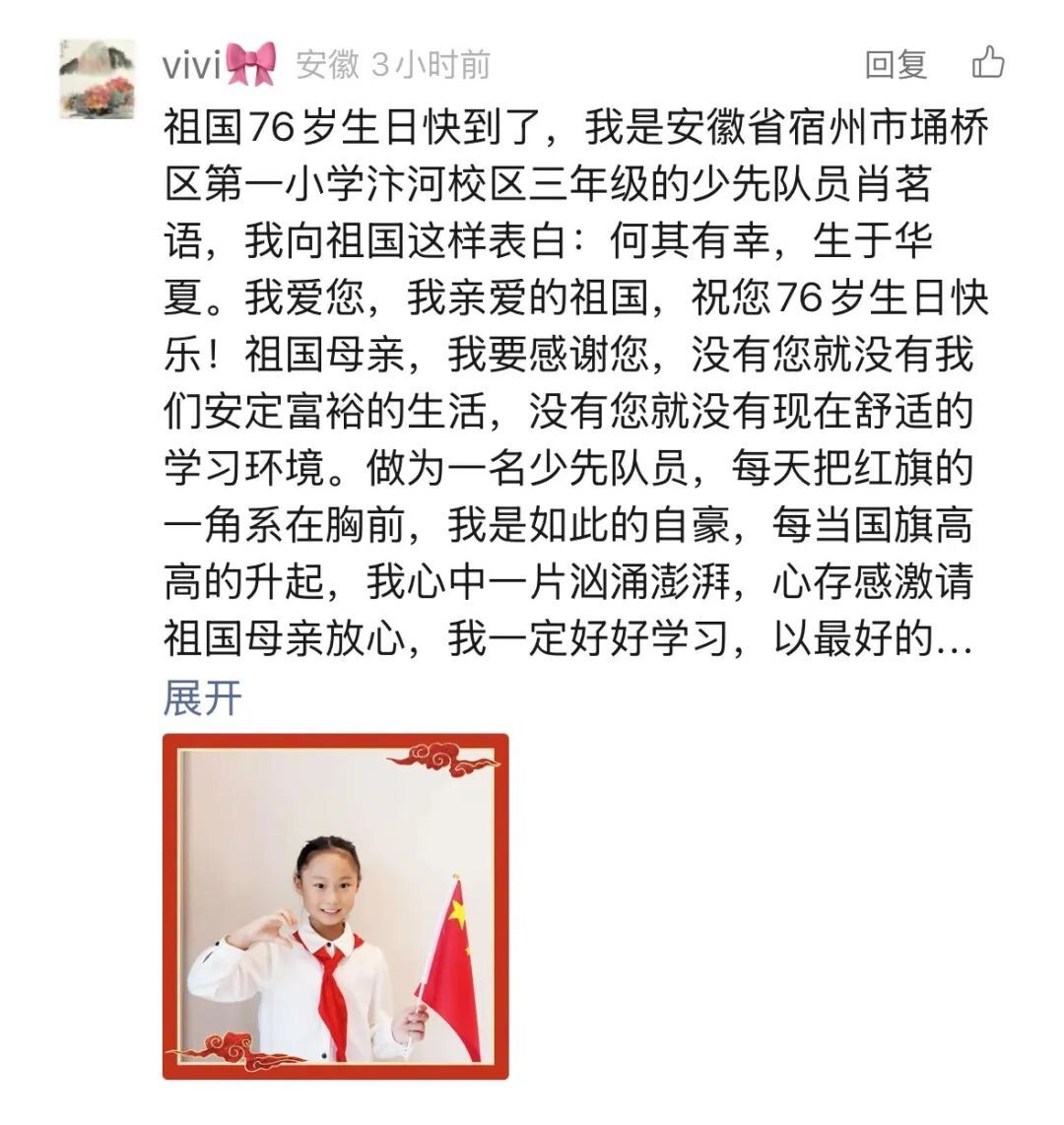 ▼江苏省苏州市星海小学 朱子阅:亲爱的祖国,在您76岁华诞的荣光时刻,我想把心底的热爱说给您听:生逢盛世,肩负荣光,我愿以青春为笔,以奋斗为墨,做一名心怀家国、脚踏实地的新时代小学生。愿祖国永远风华正茂,国泰民安!