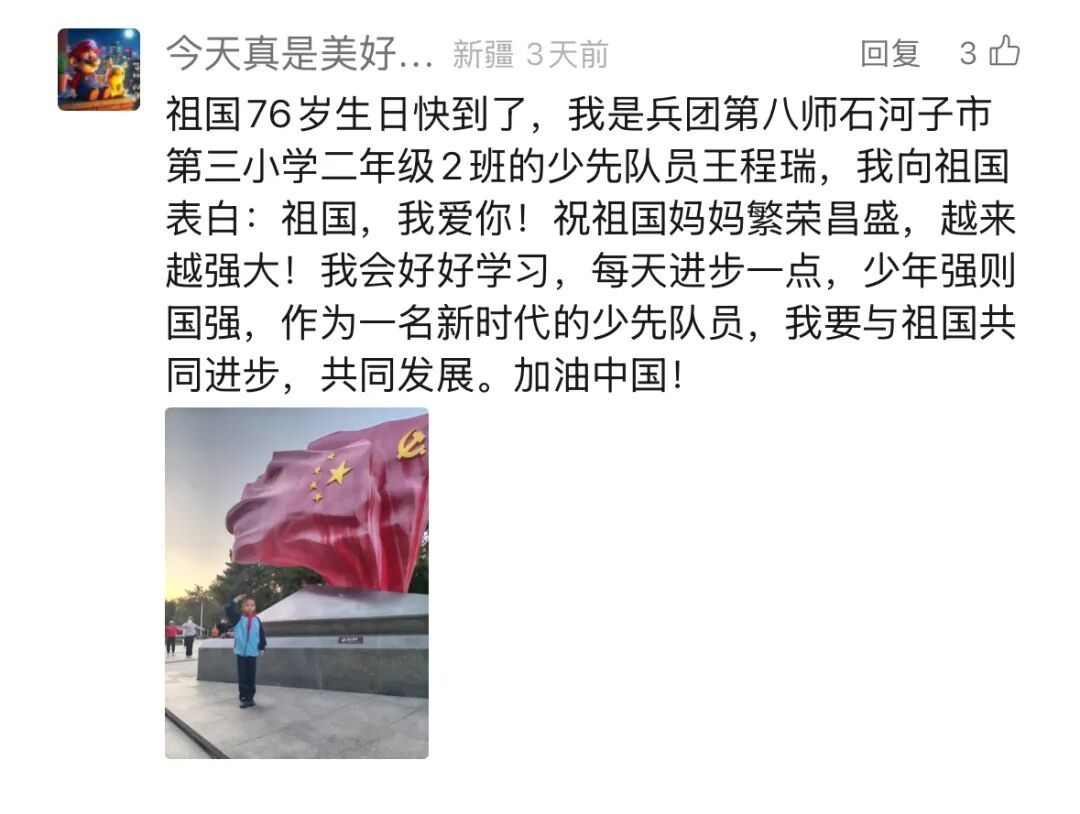 ▼新疆生产建设兵团第八师石河子市第三小学 王程瑞:祝祖国繁荣昌盛,越来越强大!我会好好学习,每天进步一点!少年强则国强!
