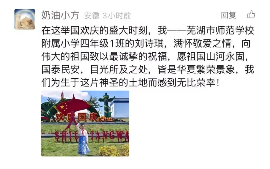▼安徽省芜湖市师范学校附属小学 刘诗琪:愿祖国山河永固,国泰民安,目光所及之处,皆是华夏繁荣景象,我们为生于这片神圣的土地而感到无比荣幸!