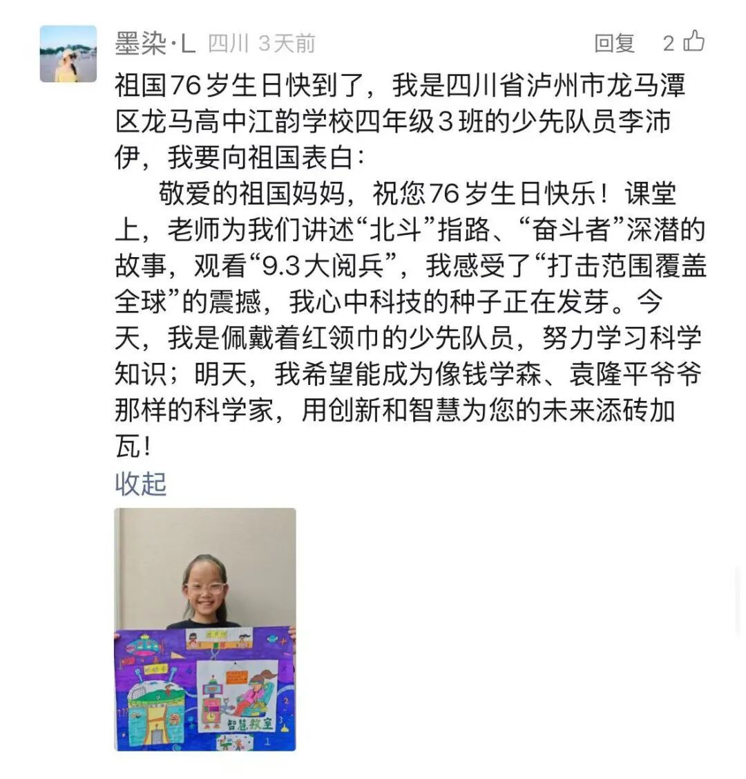 ▼四川省泸州市龙马潭区龙马高中江韵学校 李沛伊:课堂上,老师为我们讲述“北斗”指路、“奋斗者”深潜的故事,观看九三阅兵,我心中科技的种子正在发芽。今天,我是佩戴着红领巾的少先队员,努力学习科学知识;明天,我希望能成为像钱学森、袁隆平爷爷那样的科学家,用创新和智慧为未来添砖加瓦!