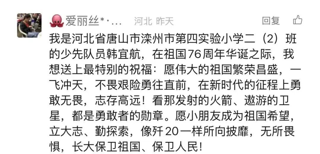 ▼河北省滦州市第四实验小学 韩宜航:愿伟大祖国繁荣昌盛!看那发射的火箭、遨游的卫星,都是勇敢者的勋章。愿我们像歼-20一样所向披靡,无所畏惧,长大保卫祖国、保卫人民!