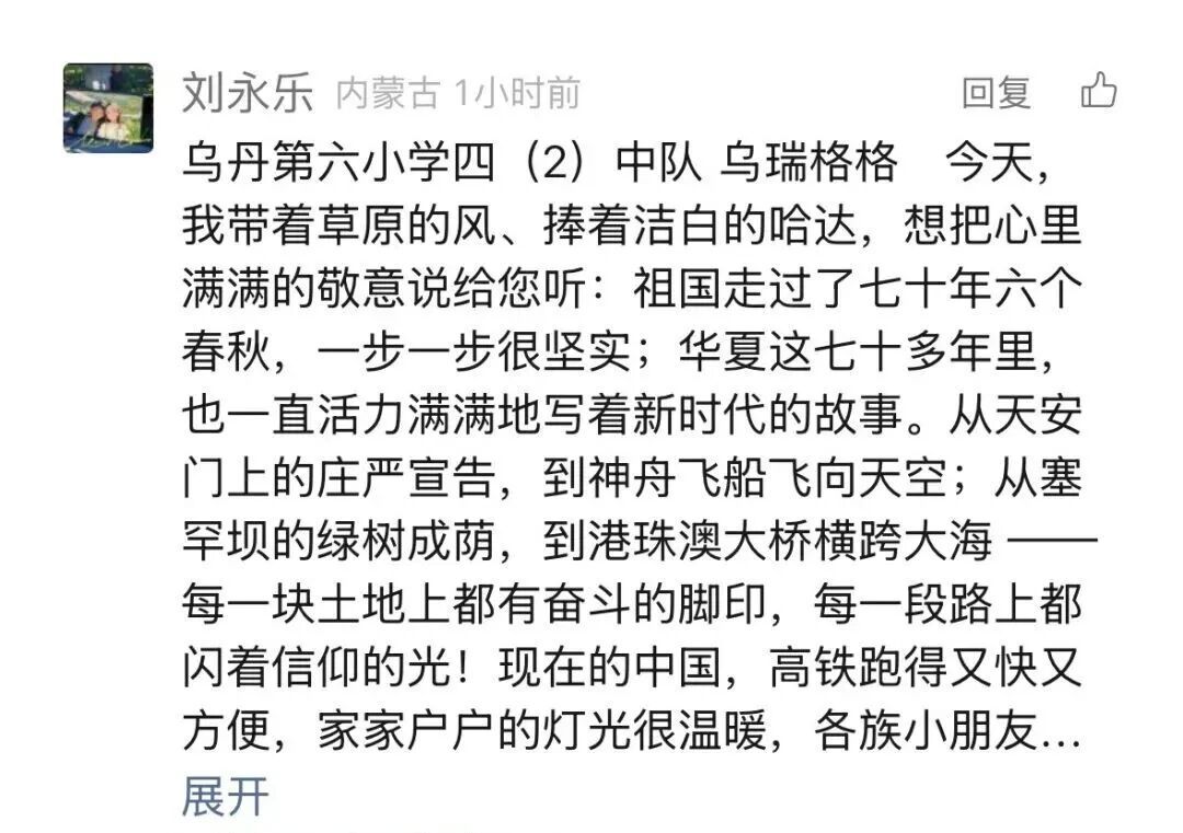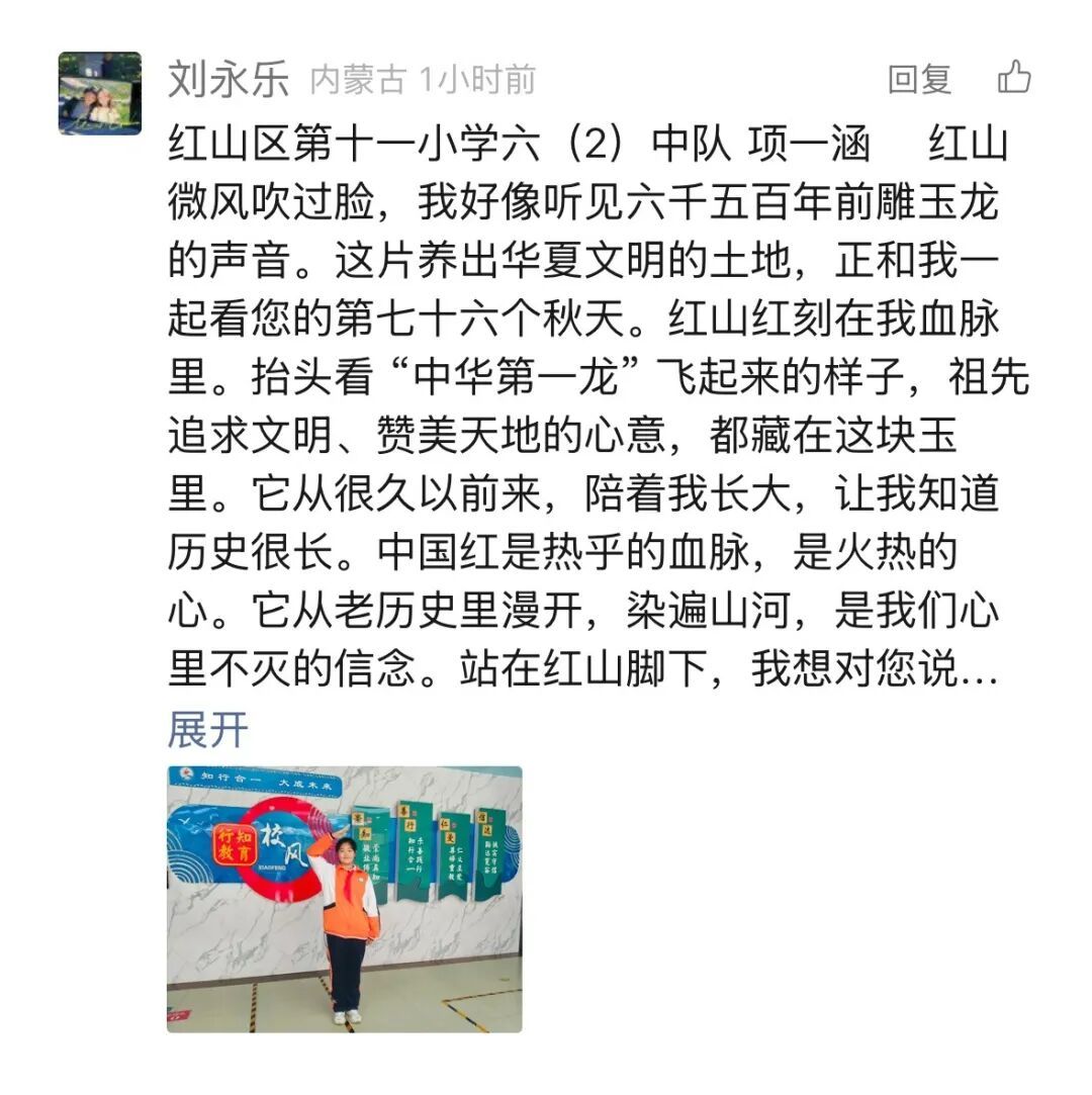 ▼内蒙古自治区赤峰市红山区第十一小学 项一涵:站在红山脚下,我想对您说:愿您像玉龙向上,像草原平安;愿每块土地繁荣,每个儿女有希望。亲爱的祖国,祝您76 岁生日快乐,年年都好,山河壮丽!
