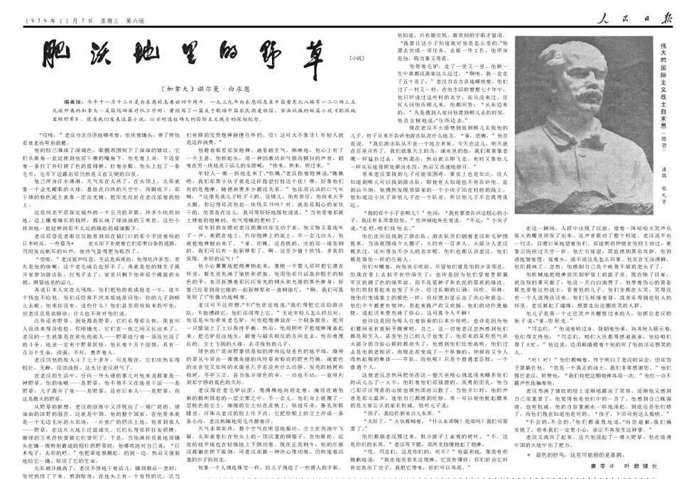 1979年11月7日,在白求恩逝世40周年之际,《人民日报》第六版以《肥沃地里的野草》为题刊载了小说《哑弹》,作为对这位伟大的国际主义战士的深切纪念。