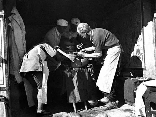 “越靠前,抢救越及时!”1939年4月,齐会战斗打响。白求恩将流动医院设在离火线只有3.5公里的温家屯村边的小庙里。激战中,炮弹在四周爆炸,震得瓦片簌簌落下,白求恩冷静地为一二〇师七一六团三连连长徐志杰进行手术。