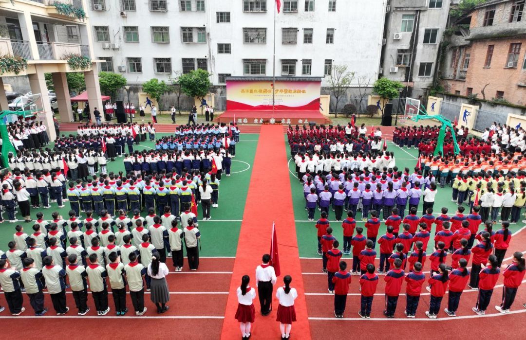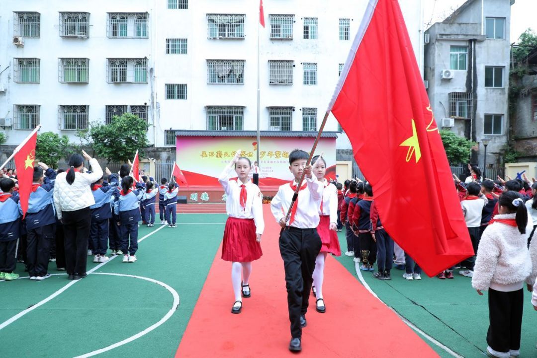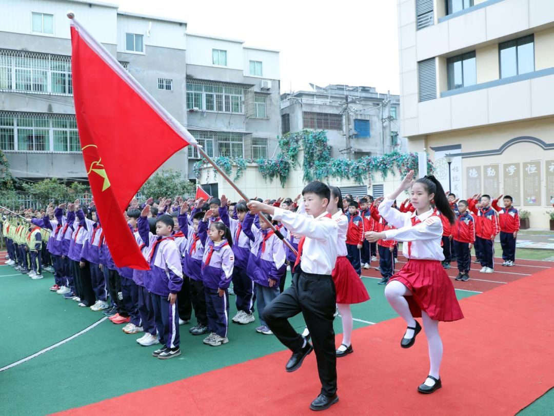 “吴石英雄大队”授旗仪式在激昂的出旗曲中拉开帷幕。旗手们迈着整齐有力的步伐庄严入场,少先队员们立正敬礼,精神饱满、目光坚定,彰显新时代少先队员的昂扬风貌。