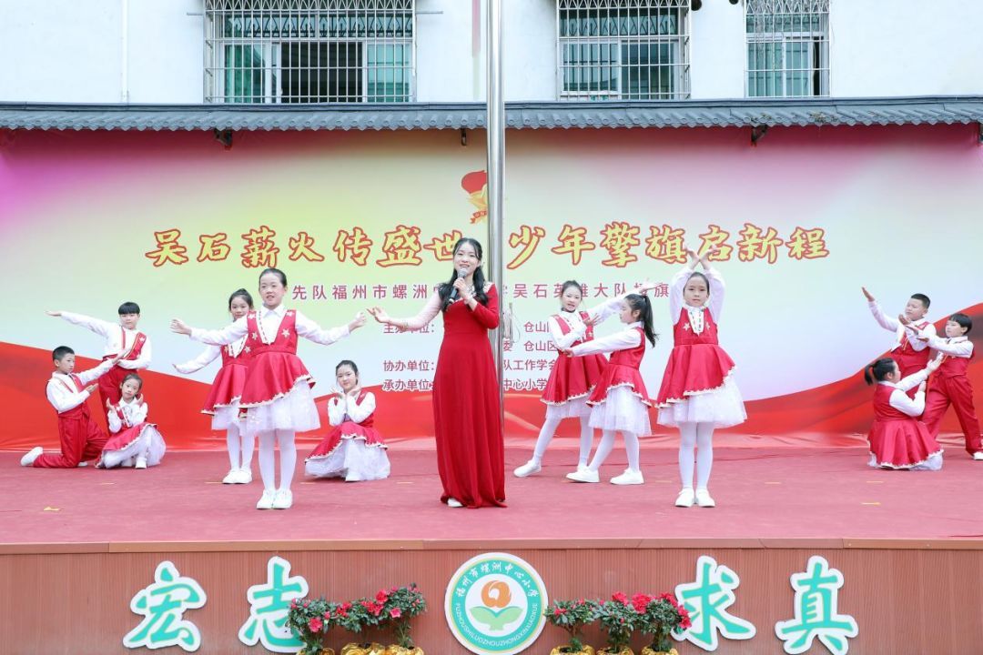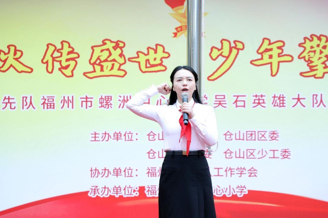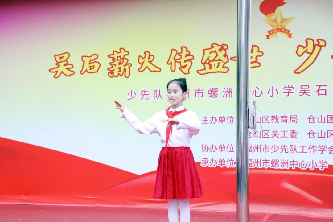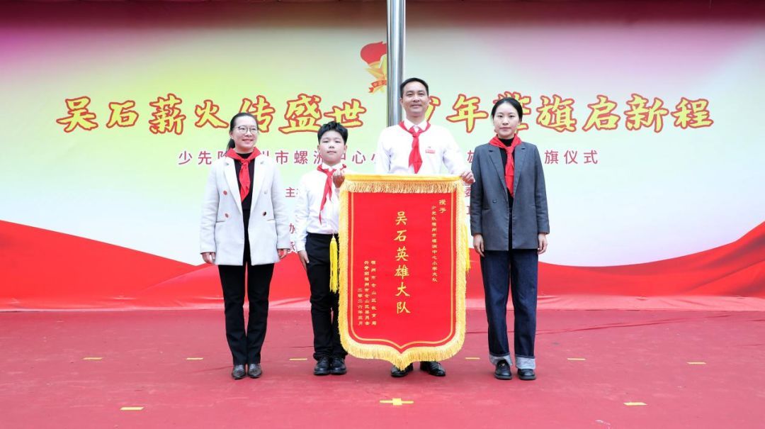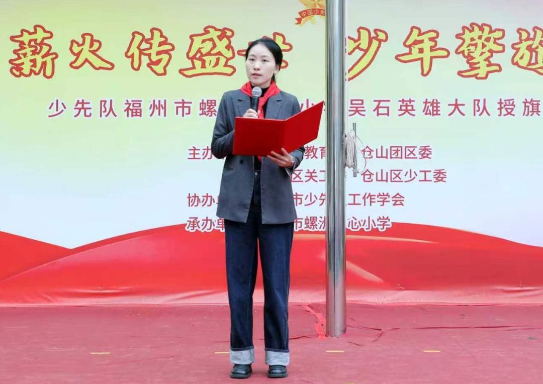共青团仓山区委书记黄彩玲和仓山区教育党委委员、区教育局党组成员、专职副总督学程娟向螺洲中心小学少先队授“吴石英雄大队”旗帜。鲜红的旗帜,承载着英雄精神与集体荣光,激励队员们传承红色基因,争当新时代好少年。