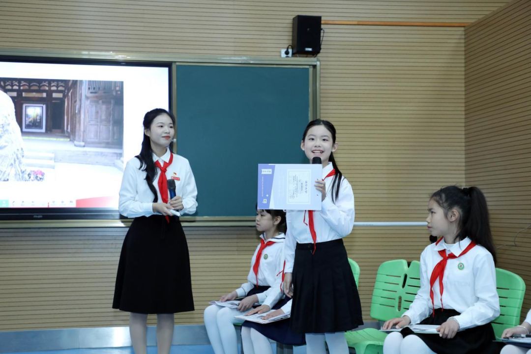 红领巾宣讲员激情演讲《凭将一掬丹心在》,深情讲述吴石将军的生平事迹与赤胆忠心;获奖书信征文朗诵《承赤胆忠魂,致吴石将军》,队员用真挚文字表达对英雄的无限崇敬;辅导员带领少先队员带来小合唱《珊瑚颂》,用悠扬的歌声缅怀革命先烈,致敬英雄风骨。