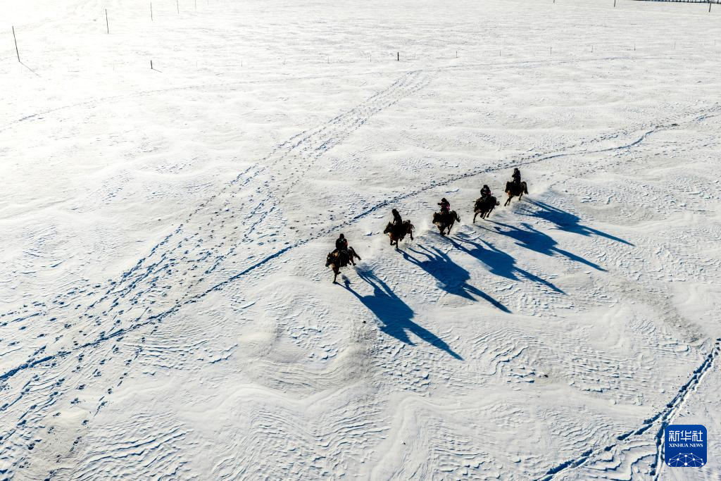12月2日,“海东青”骑警队骑警在内蒙古呼伦贝尔市陈巴尔虎旗的雪原上巡逻(无人机照片)。