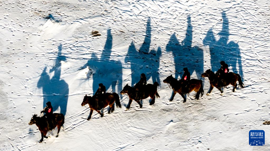 12月2日,“海东青”骑警队骑警在内蒙古呼伦贝尔市陈巴尔虎旗的雪原上巡逻。