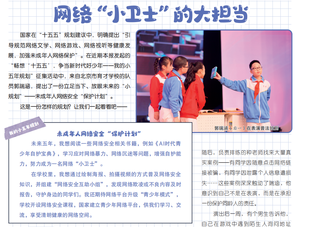 在近期本报发起的畅想“十五五,争当新时代好少年——我的小五年规划”征集活动中,来自北京市育才学校的队员郭瑞涵,提出了一份立足当下、放眼未来的“小规划”——未成年人网络安全“保护计划”。这是一份怎样的规划?快翻开报纸解锁吧!