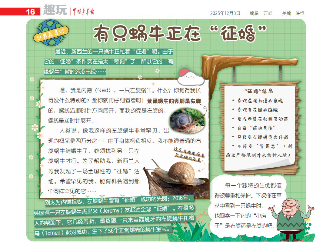 最近,新西兰的一只蜗牛正忙着“征婚”呢。由于它的“征婚”条件实在是太“苛刻”了,所以它的“有缘蜗牛”暂时还没出现。快来本报瞧瞧它的“征婚”信息,没准你身边有它的“有缘蜗牛”呢!