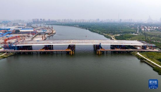这是9月16日拍摄的天津市滨海新区西中环快速路跨海河桥工程建设现场(无人机照片)。 新华社记者 赵子硕 摄