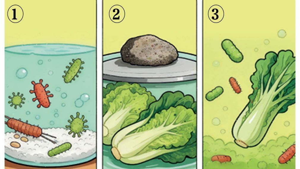 乳酸菌驾到:蔬菜与空气隔绝,喜欢氧气的霉菌“团灭”,只有乳酸菌存活下来。