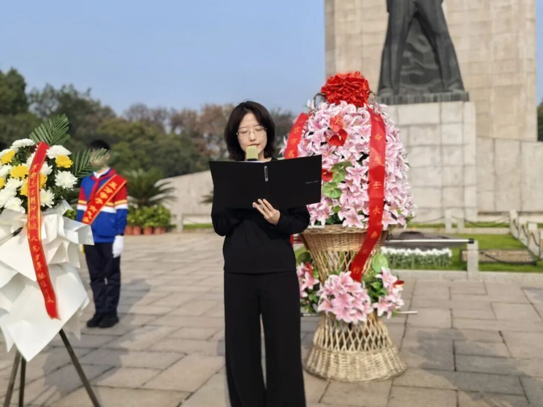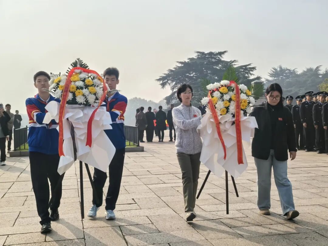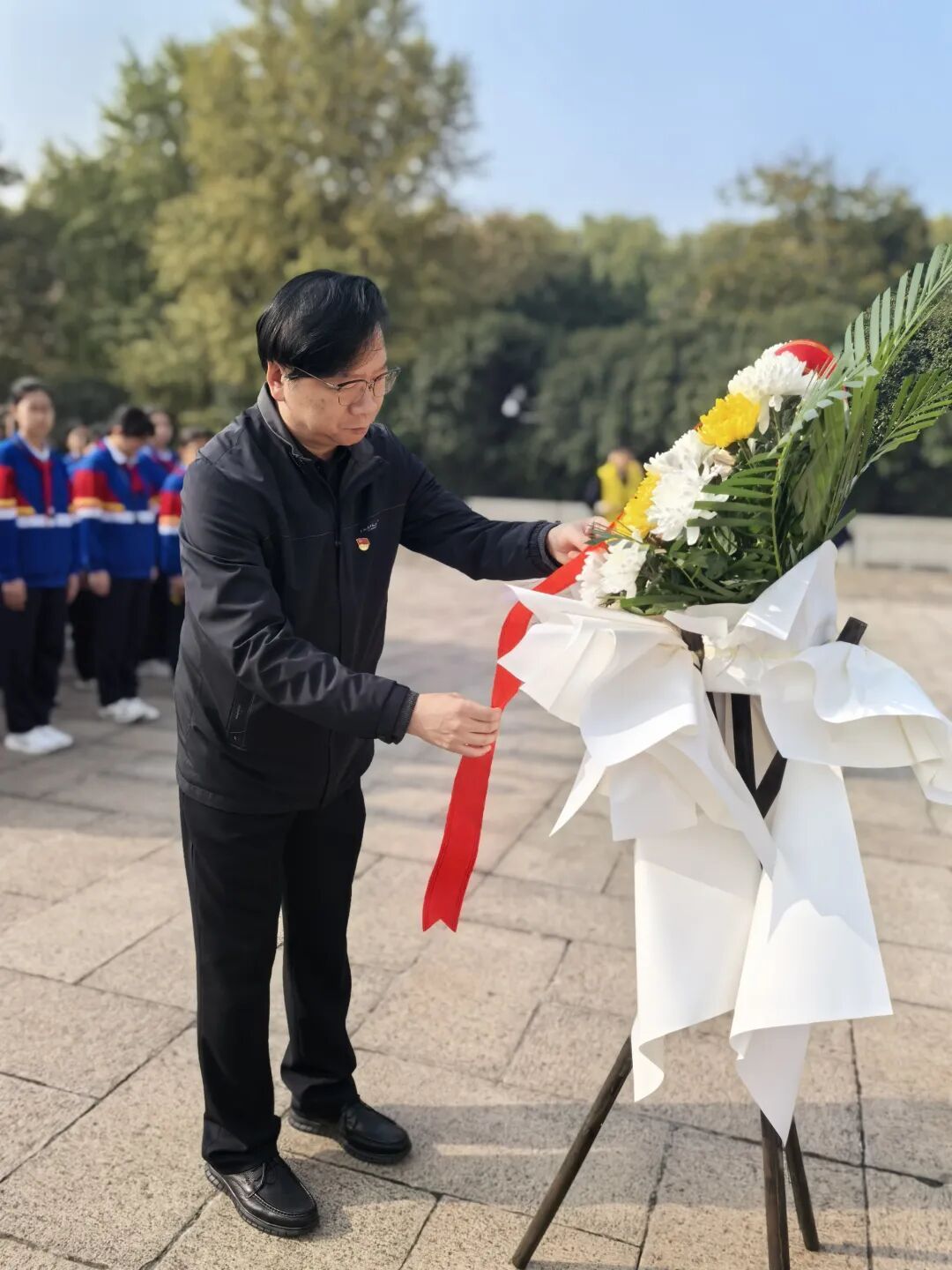 党员教师代表与少先队员代表神情肃穆,列队整齐,缓步走向纪念碑,将寄托哀思的花篮敬献于碑前,校领导为花篮整理缎带。随后,全体师生面向烈士纪念碑向英烈默哀。