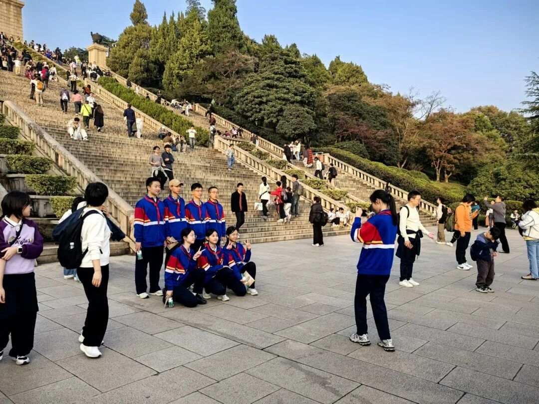 第三站,师生们登上了紫金山,谒访中山陵。沿着漫长的石阶缓缓而上,同学们对中国民主革命伟大先驱孙中山先生的敬仰之情油然而生。师生登上紫金山之巅,眺望“十朝都会”金陵城,深刻体会先生“革命尚未成功,同志仍须努力”的遗志,感悟先烈们为民族独立、人民幸福而矢志不渝的奋斗精神。