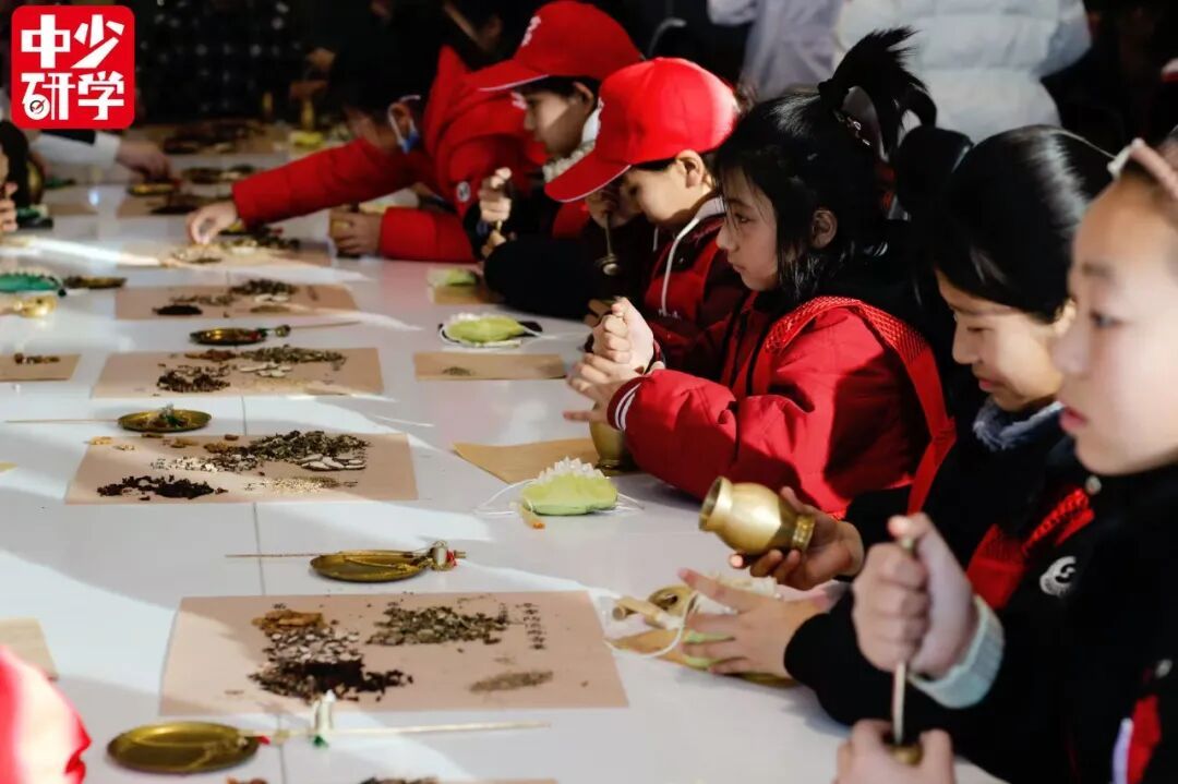在 北京同仁堂健康基地 ,孩子们开启了一项新挑战—— 制作冬季防流感香囊 。桌上摆放着藿香、白芷、细辛、苍术、石菖蒲、丁香六味中药材,还有古朴的药臼(又称“捣药器”)。 只见孩子们小心翼翼地将药材放进药臼中,用捣药杵细细捣碎,将细碎的药末装入香囊,空气中弥漫着淡淡的药香。