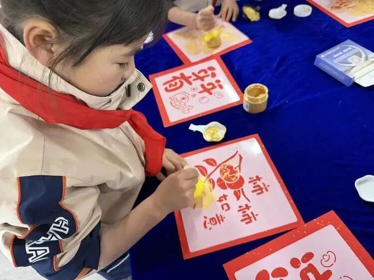 在社区工作人员和老师的指导下,队员们认真地用拓印工具蘸取颜料,小心翼翼地在模板上按压、涂抹,专注的神情尽显对传统技艺的好奇与喜爱。金黄、墨黑的颜料在红纸上渐渐勾勒出吉祥的图案与文字,一张张充满童趣的拓印作品在队员们手中诞生。