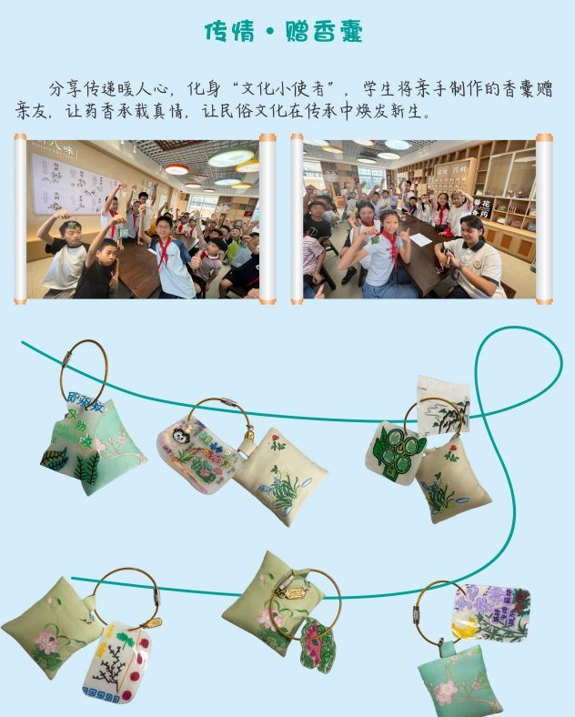 六年级将草药认知、科学配比与美术创意、文化传播跨学科融合,把传统藏进小小香囊!队员们先系统了解草药功效并完成配方搭配,再发挥创意用热缩片装饰香囊,最后化身文化小使者分享知识、赠送香囊。